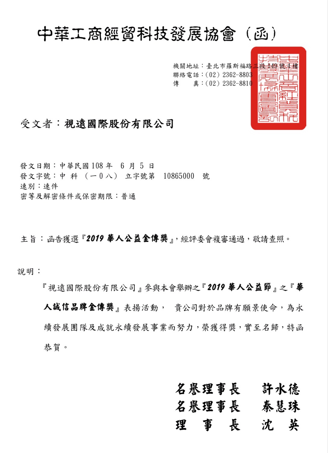 本公司榮獲 2019 華人公益節 誠信品牌金傳獎